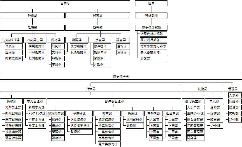 世界観Aと同じく、審神者を監督し、歴史保全戦争に関する行政を行なうのは歴史保全省。管理局・対策局・技術局の3つからなり、対策局と技術局は現世ではなく城下町に庁舎がある。審神者や刀剣男士のための法律も整備されており、世界観Aに比べると法律重視・前例重視。省庁の方針としては審神者よりも省の利益に傾きがちで、良くも悪くも『官僚的』な方針が多い。