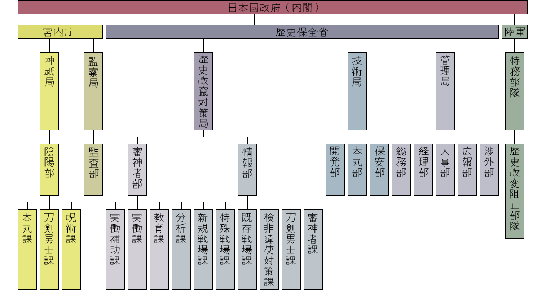 審神者は歴史保全省歴史改竄対策局審神者部実働課所属となります。歴史保全省が審神者及びその業務の監督を行ないます。但し、前線指揮官である審神者は本来陸軍特殊部隊の士官(将官・佐官・尉官)であり、軍人です。歴史保全省には出向しているという形式となります。また、刀剣男士という付喪神(分霊)を指揮し、時代遡行軍という異形を相手とすることから宮内庁神祇局及び護歴神社とも連携を取るものとします。
