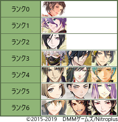 - 水・土:薬研藤四郎・一期一振・三日月宗近・骨喰藤四郎・鶯丸・物吉貞宗・謙信景光